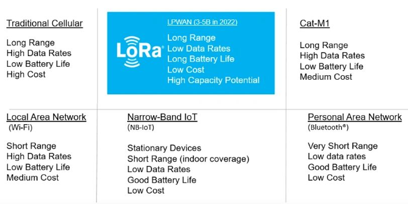 LoRa technology is a new wireless data communication protocol designed specifically for long-range connectivity, low-power communications, long battery life and low cost.